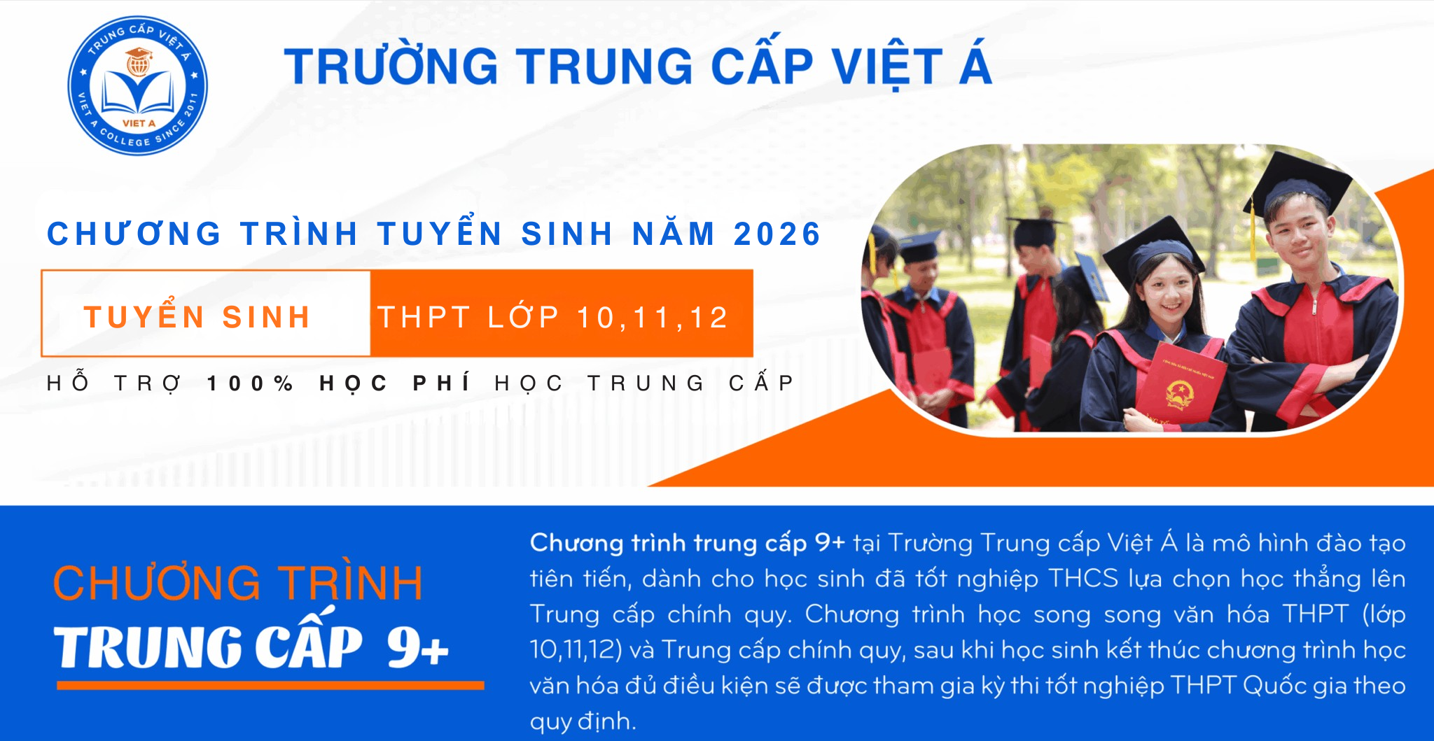 Trường Trung cấp Việt Á là đơn vị giáo dục ngoài công lập tuyển sinh trên phạm vi cả nước. Nhà trường tuyển sinh hệ trung cấp theo hình thức xét tuyển đầu vào.
